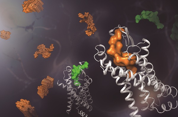 图片:甲酰肽受体FPR2结构示意图。FPR2与炎症、多发性硬化症及神经退行性疾病等密切相关。图下方用灰色飘带表示的分别为FPR2与甲酰化humanin的复合物结构(左)和FPR2与Aβ42的复合物结构(右),Aβ42与humanin分别用橙色和绿色的表面图表示。(图片由吴蓓丽研究组提供)