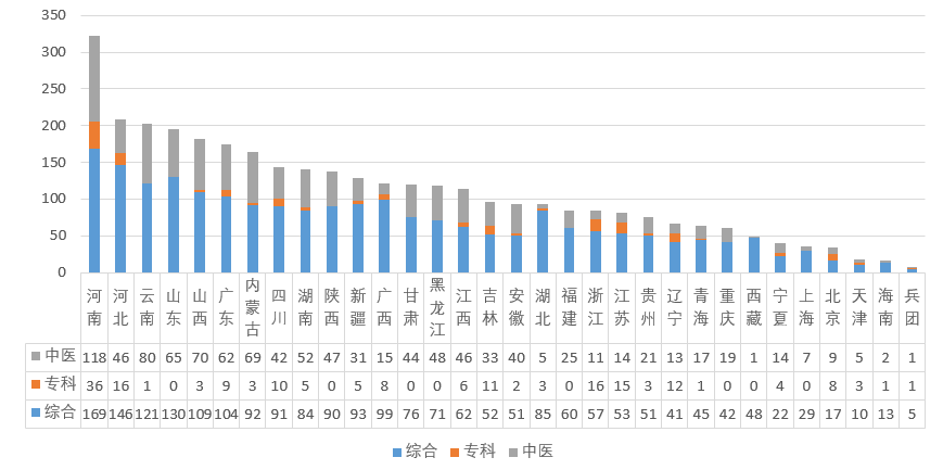 经各省级卫生健康行政部门和中医药主管部门审核确认,全国共3472家二级公立医院参加2020年度绩效考核,约占当年全国二级公立医院总数的64%。其中,西医类医院2400家(综合医院2221家,专科医院179家),约占当年全国西医类二级公立医院总数的65%;中医类医院1072家,约占当年全国中医类二级公立医院总数的60%(见图1)。与2019年相比,参加考核的医院数量增加398家,其中新增470家,主要集中在四川、河北、西藏等省份,因合并、升级、撤销等原因退出考核72家。