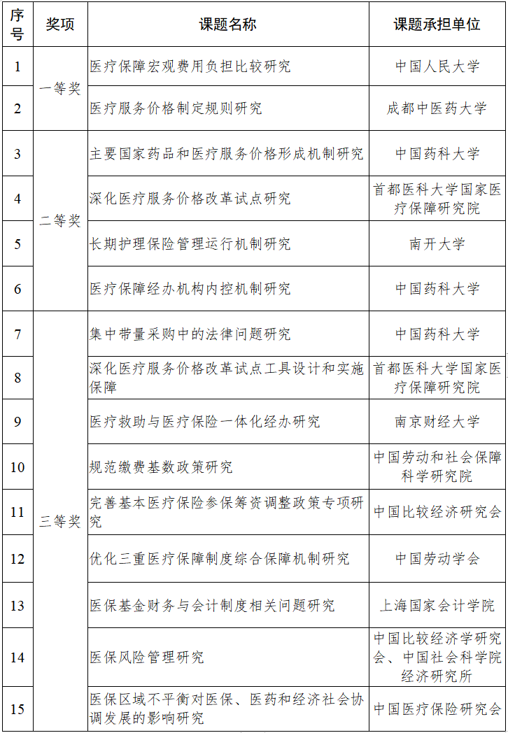 我局自组建以来,陆续委托高等院校、科研机构等开展医疗保障领域课题研究,形成了一系列研究成果,为推动医保高质量发展提供了重要支撑。在成功组织第一届课题研究成果评选活动的基础上,近期我局组织开展了第二届课题研究成果评选,经专家两轮计分评审,自2020—2021年度140项课题研究成果中,评定出国家医疗保障局优秀课题研究成果奖15名,现予以公布。