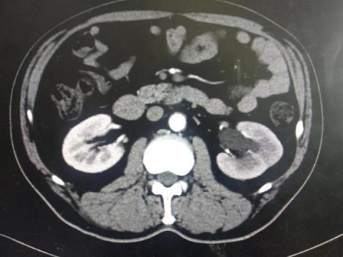 患者,男,53岁,因“左侧腰部疼痛不适半月余”入院。患者自诉于半月前无明显原因及诱因出现左侧腰部疼痛,呈钝痛,阵发性发作,平卧后加重,伴恶心 ,无呕吐,无尿频、尿急,尿痛,无肉眼血尿,发热。曾在外院就诊,行泌尿系彩超示左肾轻度积水。今为求进一步诊治来院就诊。以“腰痛待查,左肾积水”收治入院。既往高血压10余年,口服硝苯地平缓释片,血压最高达160/80mmhg左右,控制尚可。无糖尿病病史。否认心脏病史,无外伤、手术史,无药物过敏史。