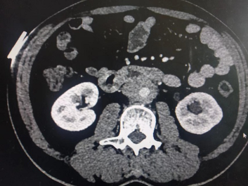 患者,男,53岁,因“左侧腰部疼痛不适半月余”入院。患者自诉于半月前无明显原因及诱因出现左侧腰部疼痛,呈钝痛,阵发性发作,平卧后加重,伴恶心 ,无呕吐,无尿频、尿急,尿痛,无肉眼血尿,发热。曾在外院就诊,行泌尿系彩超示左肾轻度积水。今为求进一步诊治来院就诊。以“腰痛待查,左肾积水”收治入院。既往高血压10余年,口服硝苯地平缓释片,血压最高达160/80mmhg左右,控制尚可。无糖尿病病史。否认心脏病史,无外伤、手术史,无药物过敏史。