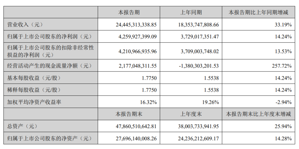 8月28日晚间,“疫苗茅”重庆智飞生物制品股份有限公司(智飞生物,300122)披露半年度报告,上半年营业收入244.45亿元,同比增长33.19%;归母净利润42.6亿元,同比增长14.24%;归母扣非净利润42.11亿元,同比增长13.53%。