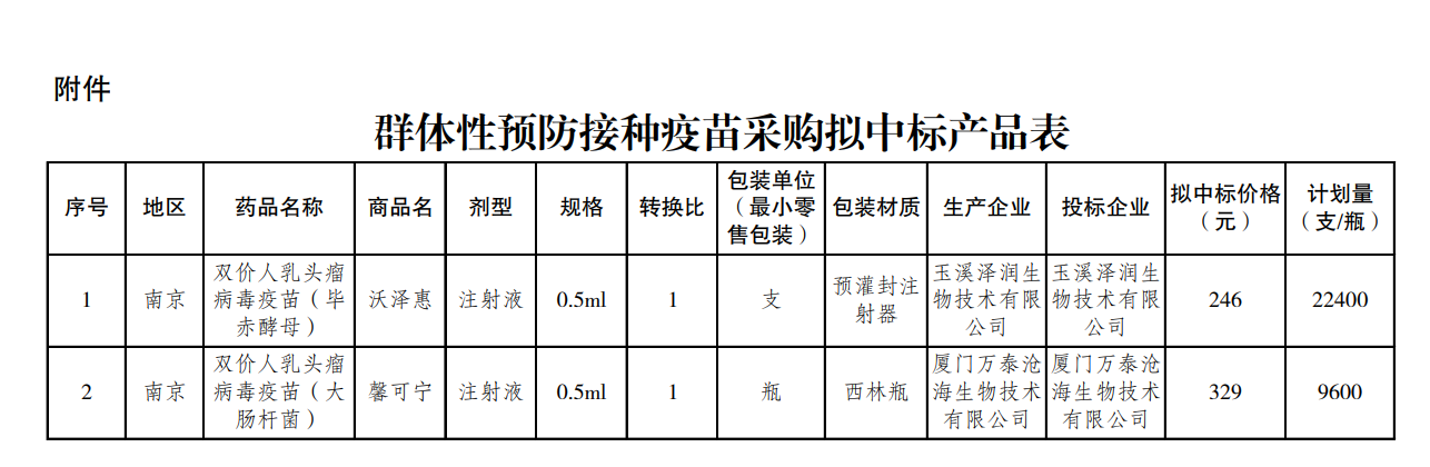 2022年5月,江苏省公共资源交易平台公示了《省公共资源交易中心关于公示群体性预防接种疫苗采购结果的通知》,沃森生物和万泰生物共同中标南京市二价HPV疫苗,其中沃森生物中标价246元/支、计划中标量22400支/瓶,万泰生物中标价329元/支,计划中标量9600支/瓶。