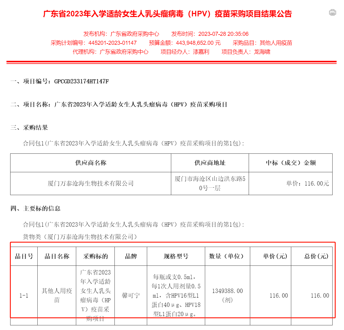 2023年7月,广东省政府采购中心官网公布的广东省2023年入学适龄女生人乳头瘤病毒(HPV)疫苗采购项目结果公告中,万泰生物则以116元/支的价格中标。相比于最初的329元,降幅约64%。