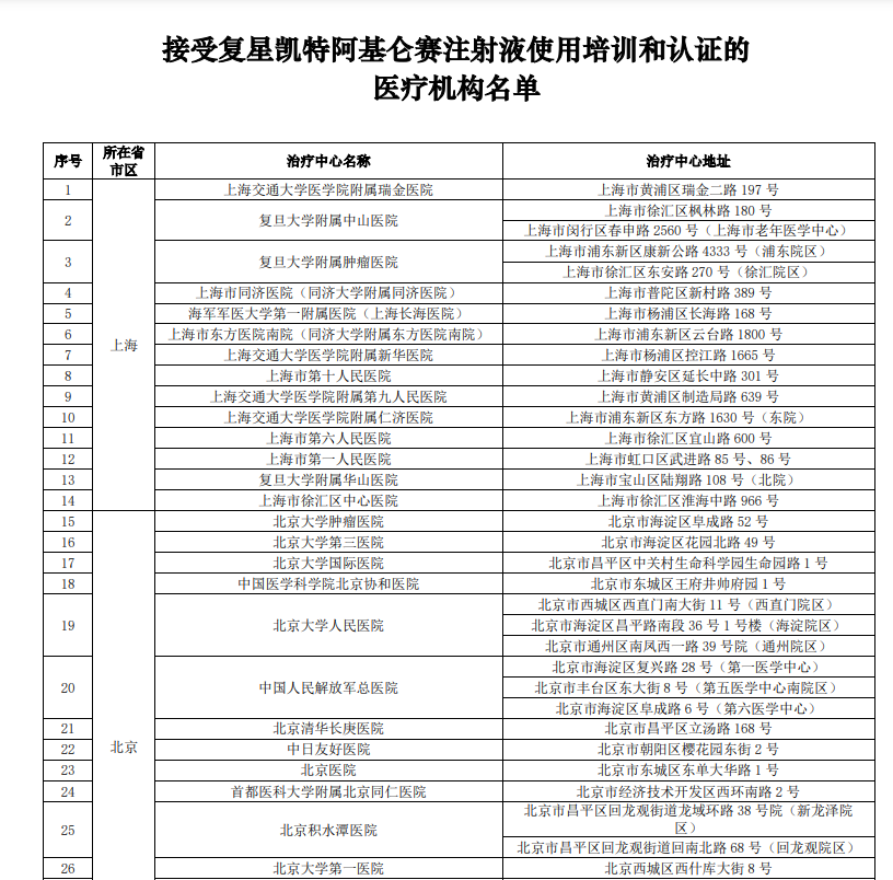 接受阿基仑赛注射液使用培训和认证的部分医疗机构名单 来源:复星凯特官网