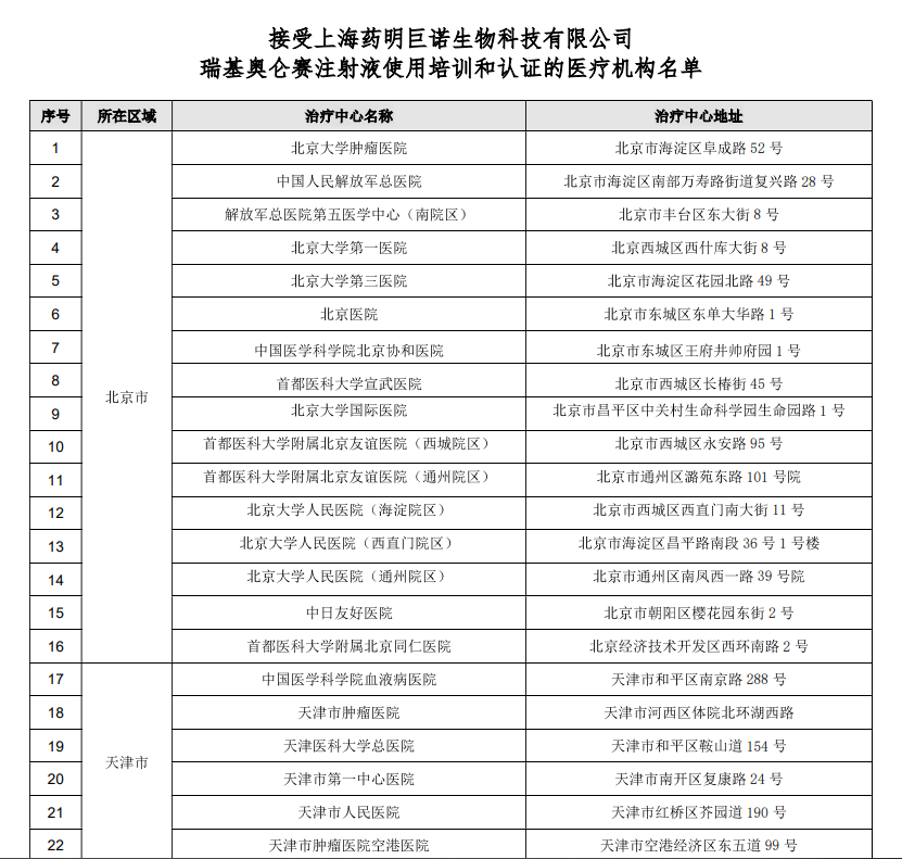 接受瑞基奥仑赛注射液使用培训和通过认证的医疗机构部分名单 来源:药明巨诺官网
