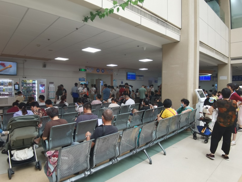 9月5日上午9时许,儿科医院门诊楼2内科诊区诊室外面,候诊的家长和孩子们人头攒动。