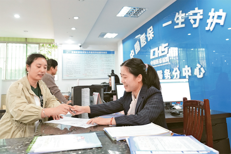 2023年10月初,重庆市北碚区医疗保障局联合相关镇街打造的5个医保政务服务分中心正式启用,主要经办医保关系转移接续、个人账户一次性支取、医保补缴等19项医保业务,为周边企业及群众提供更加优质、高效、便捷的医保公共服务。图为10月9日,市民在北碚区静观镇医保政务服务分中心办理医保相关事宜。人民图片 秦廷富/摄