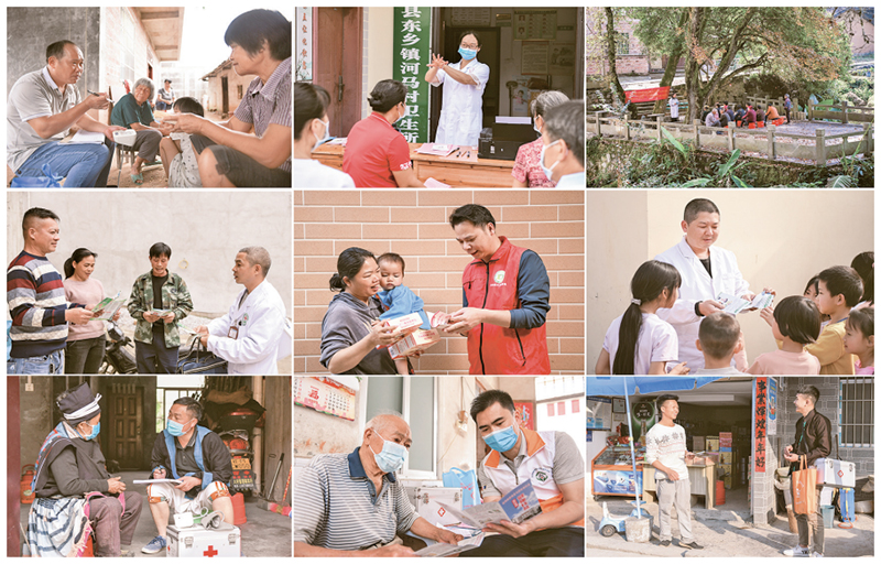 2024年8月19日是第七个中国医师节。让更多群众能在“家门口”看病,是深化医药卫生体制改革的重要目标。最新数据显示,我国有495万名基层卫生健康工作者,其中有110万名乡村医生,发挥着“健康守门人”的重要作用。这张拼版照片显示的是乡村医生们在出诊中开展健康咨询及知识宣传工作。新华社记者 曹祎铭/摄