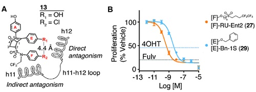 详细的晶体结构分析表明,上述化合物不需要“直接拮抗”中的化学侧链,仅仅通过磺酰胺链接的芳环影响关键螺旋12相邻的螺旋11的位置,从而间接影响了螺旋12的正确定位,来获得对野生型乳腺癌细胞的完全抑制,这种独特的机制被称为“间接拮抗”。